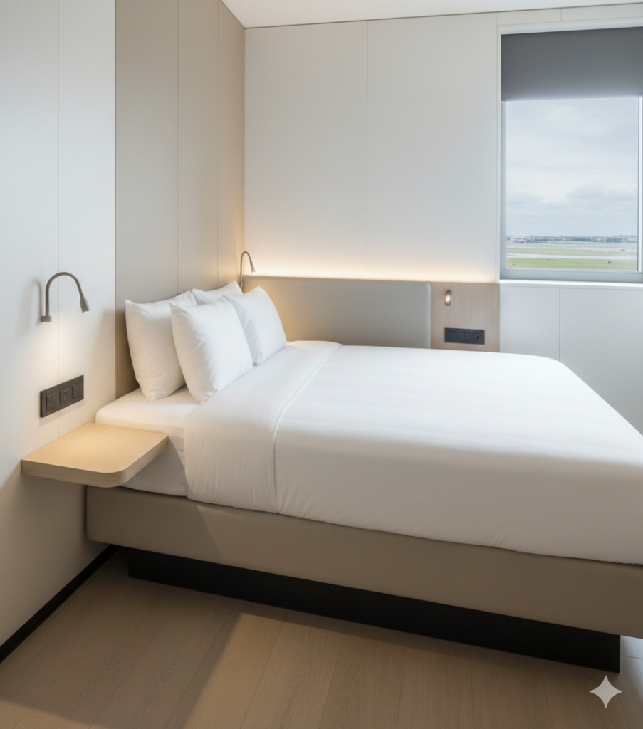 Ideal para parejas o compañeros de viaje. Cuenta con una cama Queen Size, mayor amplitud y todas las comodidades para dos personas. Privacidad y confort absoluto en el corazón de la terminal.